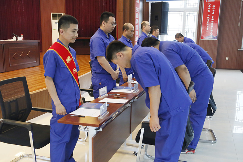 仪式上,结对师徒郑重地在师徒协议上签字,徒弟向师傅鞠躬行拜师礼,师傅向徒弟赠予学习条记本并寄语勉励。